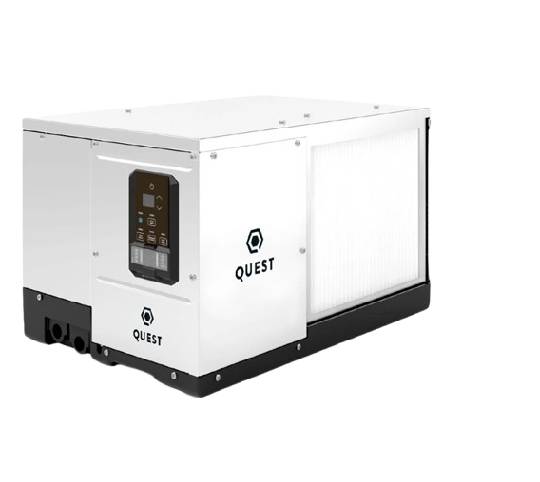 The Quest 100 Industrial Dehumidifier removes excess moisture from the air using advanced refrigerant-based condensation technology. It pulls humid air into the unit, extracts moisture, and releases dry air back into the space.